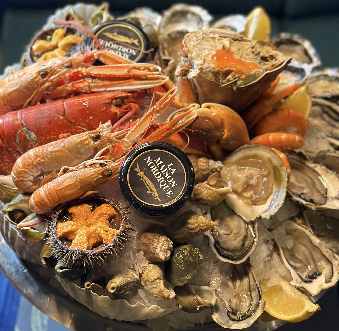1 tarama truffé, 2 demi-homards, 8 crevettes roses BIO, 4 Gillardeau n°3, 4 Fine de Claire n°3, 4 Utah Beach n°3, 2 pousses en Claire n°3, 2 Belon 00, 2 oursins, 1 pince de crabe XL, 1/2 tourteau, 4 langoustines, des bulots.